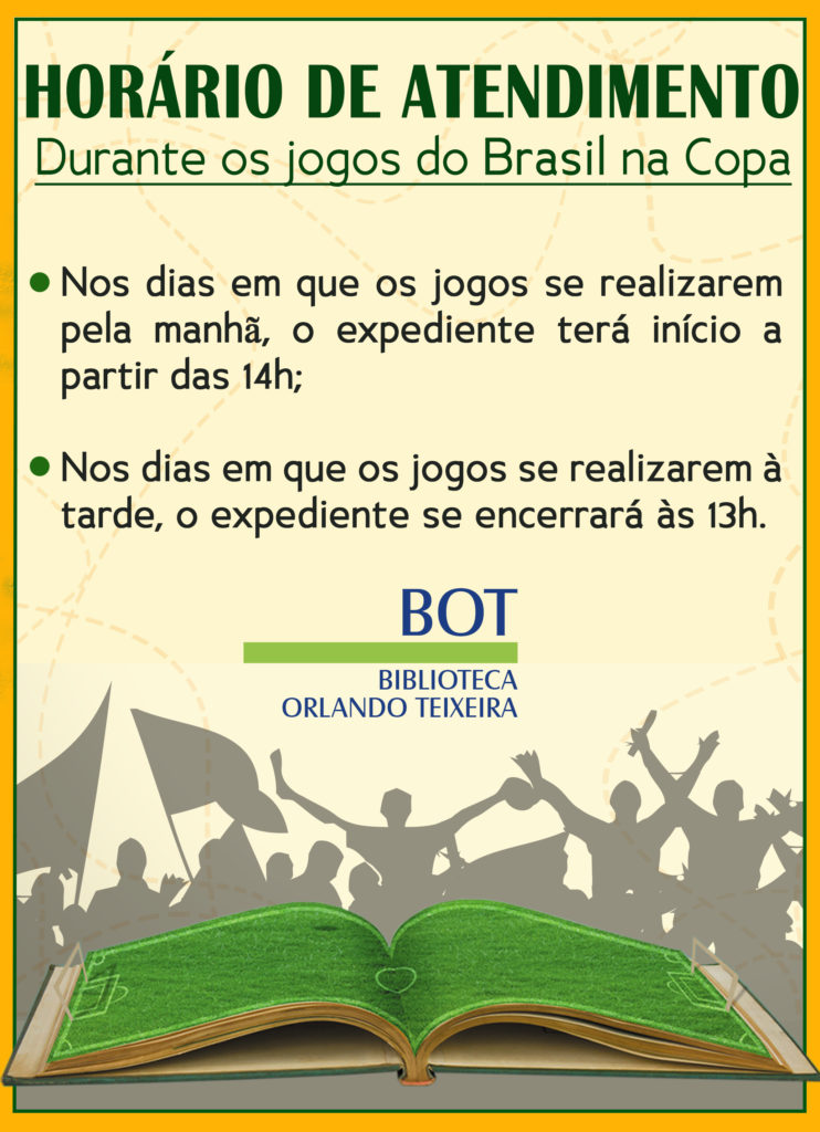 A Biblioteca Orlando Teixeira informa seu horário de expediente nos dias de jogos da Seleção Brasileira de Futebol na Copa do Mundo FIFA 2018